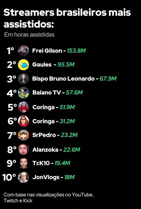 O que parecia improvável aconteceu: um sacerdote católico superou os maiores nomes do entretenimento digital e se tornou o streamer mais assistido do Brasil em 2025. Frei Gilson liderou o ranking nacional com 153,8 milhões de visualizações, deixando para trás gigantes do universo gamer, do humor e das lives de reação — um feito inédito nas plataformas de streaming.