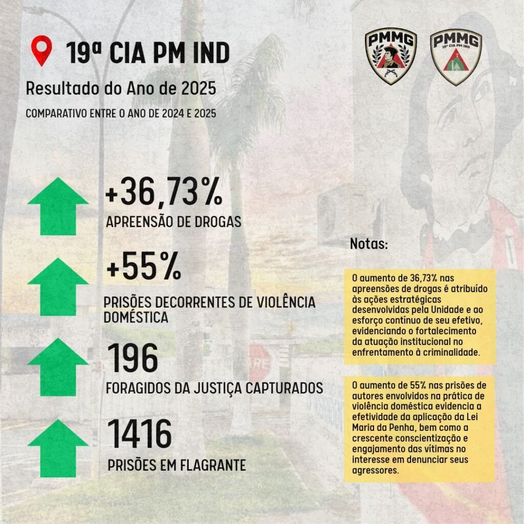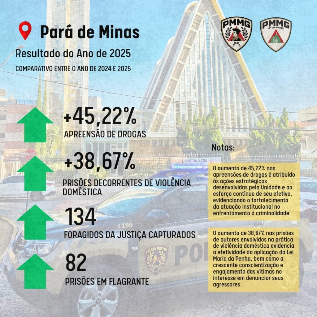 O balanço operacional da Polícia Militar de Minas Gerais referente ao ano de 2025 confirma avanços expressivos na segurança pública em Pará de Minas e em toda a área de atuação da 19ª Companhia PM Independente, com redução consistente dos crimes e, ao mesmo tempo, aumento significativo da produtividade policial.