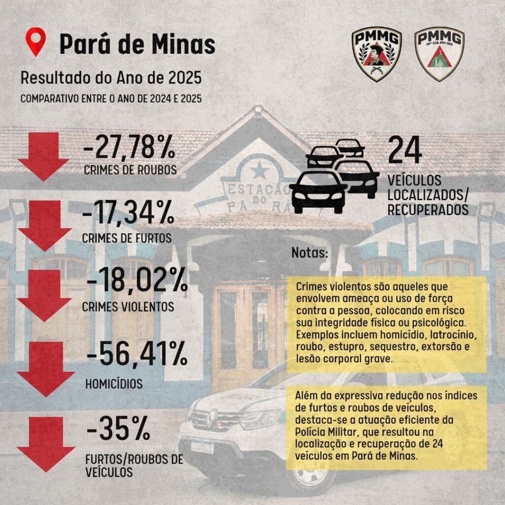 No município de Pará de Minas, os indicadores criminais apresentaram reduções relevantes, especialmente nos crimes que mais afetam a sensação de segurança da população: