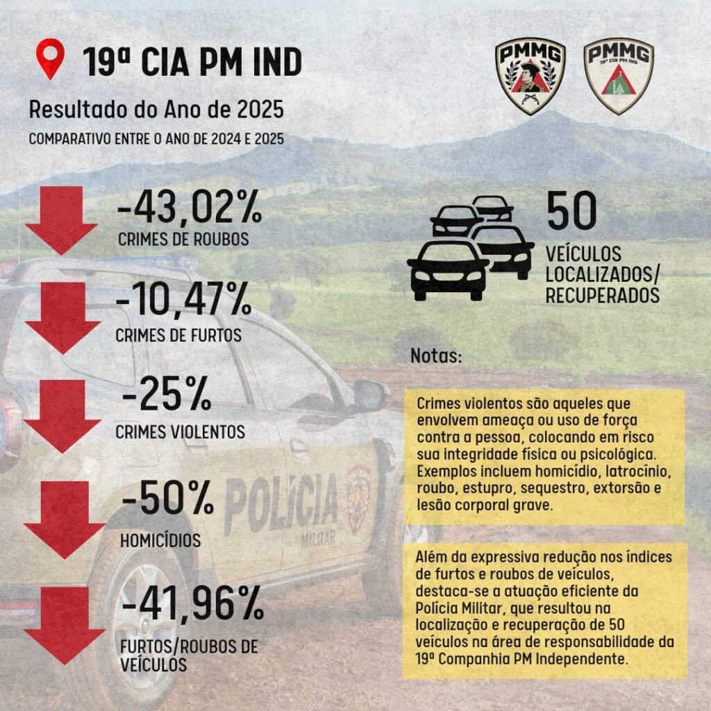 Na área total de responsabilidade da 19ª Companhia PM Independente, os números também confirmam uma redução expressiva da criminalidade em 2025: